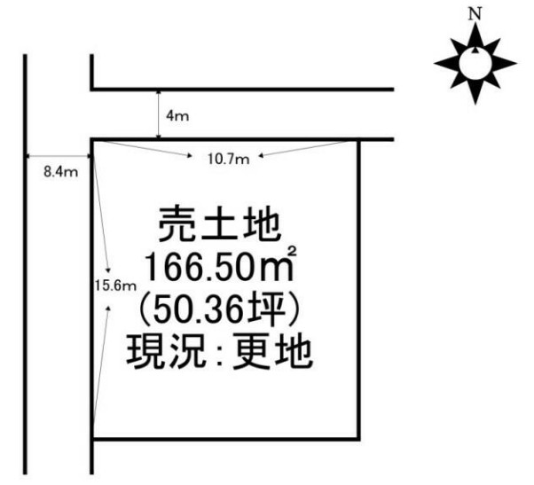 北・西の角地で、北側約4m私道、西側約8.4m公道に面しています。