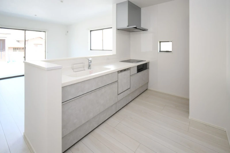 対面式キッチン・IHコンロ・水なし両面焼きグリル・食器洗い乾燥機・キッチン手元コンセント・浄水器内蔵型水栓・カウンタートップ人造大理石