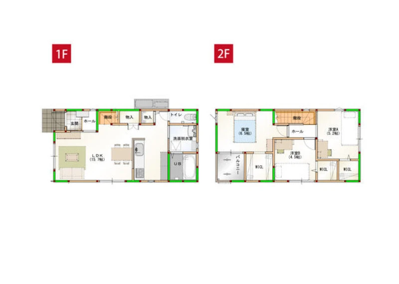 間取り:3LDK(1F:LDK15.7帖 2F:洋室5.2帖、洋室4.5帖、寝室6.5帖)