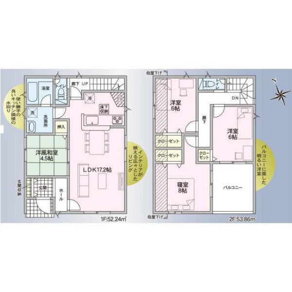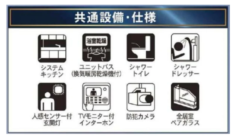 | 設備 | 都市ガス、電気、上水道、下水道、システムキッチン、カウンターキッチン、浄水器、給湯、トイレ2箇所、温水洗浄便座、シャンプードレッサー、浴室乾燥機、フローリング、複層ガラス、ルーフバルコニー、収納スペース、床下収納、ディンプルキー、モニタ付インターホン、火災警報器等設置済、バス・トイレ別、建設住宅性能評価取得(予定含む) | ||