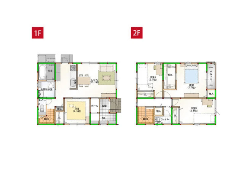 間取り4LDK(1F:LDK15.1帖、洋室4.5帖 2F:洋室5.1帖、洋室6.6帖、寝室7.7帖)