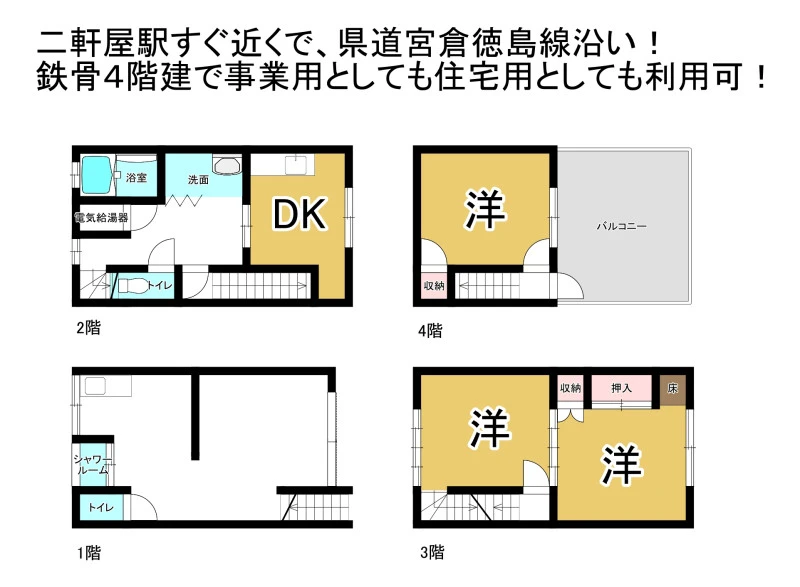 二軒屋駅すぐ近くで、県道宮倉徳島線沿い!鉄骨4階建で事業用としても住宅用としても利用可!1階は元店舗部分で土間になっています。1階を改装して駐車場にする等、店として活用も可!