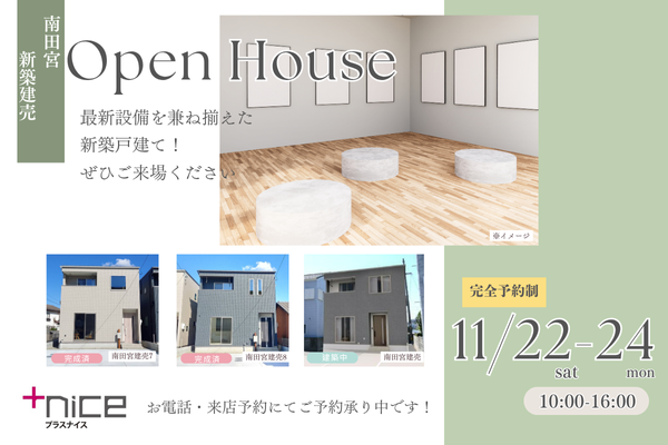 南田宮1丁目(1棟)・4丁目(2棟)で新築戸建てのオープンハウスを開催します。