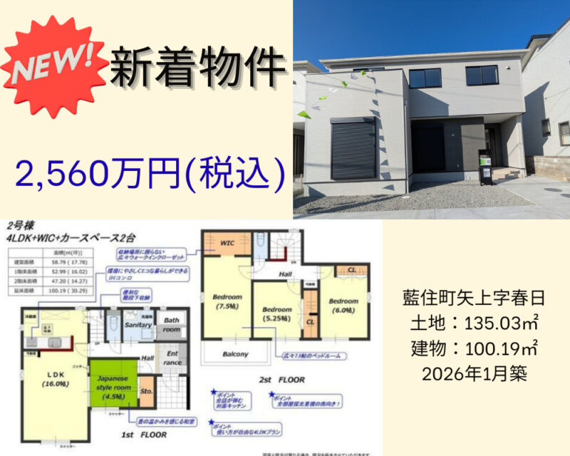 人気のエリアに待望の新築物件が登場しました。家族の会話が自然と弾む対面キッチンを採用し、環境にやさしく安心して使えるIHコンロで、エコな暮らしを実現します。各部屋に収納スペースを確保しており、整理整頓もしやすい間取りです。広々としたウォークインクローゼットは衣類や季節用品の収納にも便利。開放感のあるルーフバルコニー付きで、洗濯物も快適に干せます。駐車スペースは2台分確保。藍住西小学校まで508m(徒歩約7分)、藍住中学校まで1502m(徒歩約19分)と、通学環境も整った子育て世帯に嬉しい新築住宅です。